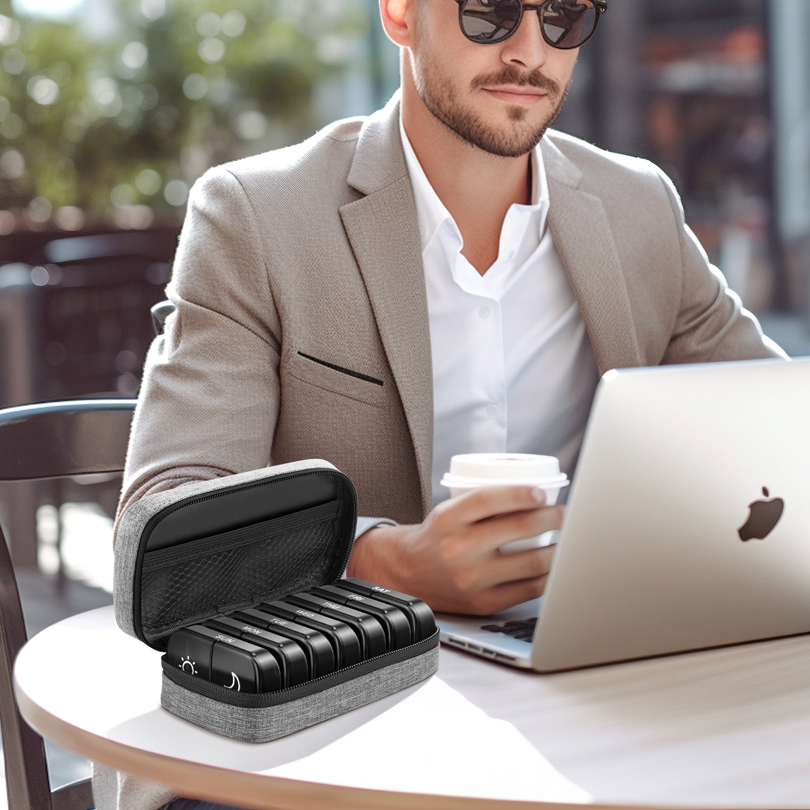 - Super Canvas Bag: This travel pill organizer has a premium zipper to make it run smoothly. The outer compartment and built-in mesh bag of this medicine organizer box can placing small flat objects such as prescriptions, medical cards and other accessories like keys, all these thoughtful designs make this gray travel pill box a perfect choice for people's business travel.
