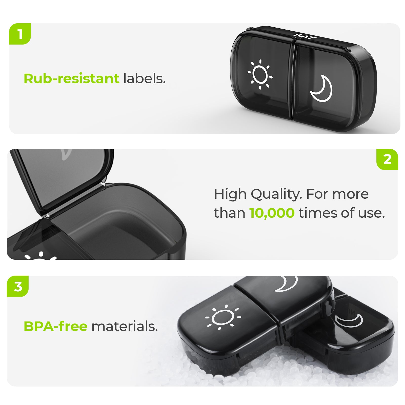 - Super Quality: The inner hinges are reinforced for 10,000 uses. The medication organizer letters were UV printed, which is long-lasting over 10,000 uses, never worry about the rub-off labels. Made of BPA-free materials that are harmless to humans. And canvas box never worry about breaking.
