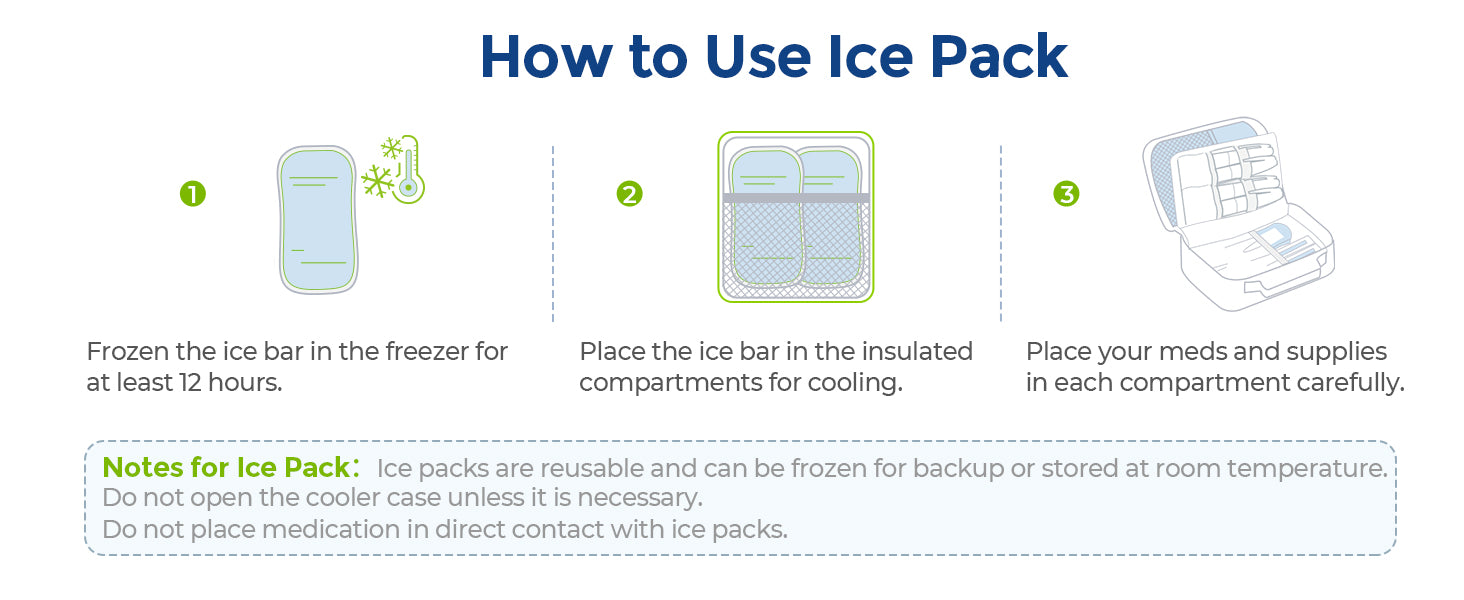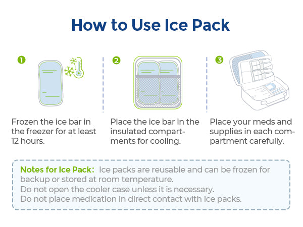 - WHAT YOU RECEIVE. 1 x Large Storage Insulin Cooler Travel Case (8.5" x 6.1" x 3.3"), 4 x 160g Reusable Ice Packs, 1 x User Manual, AUVON Warranty Support and Friendly Customer Service.