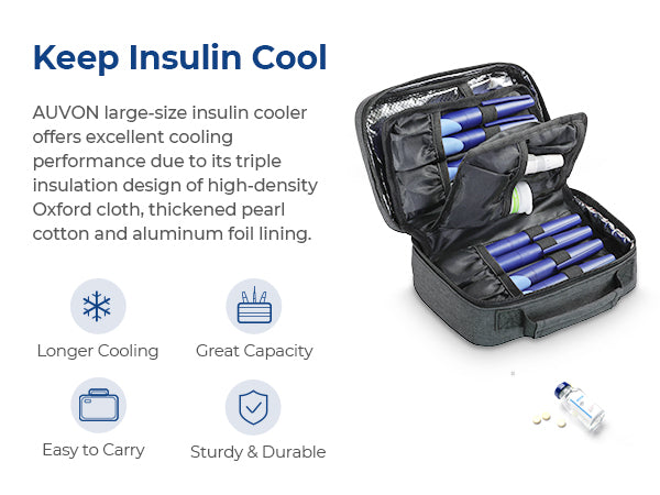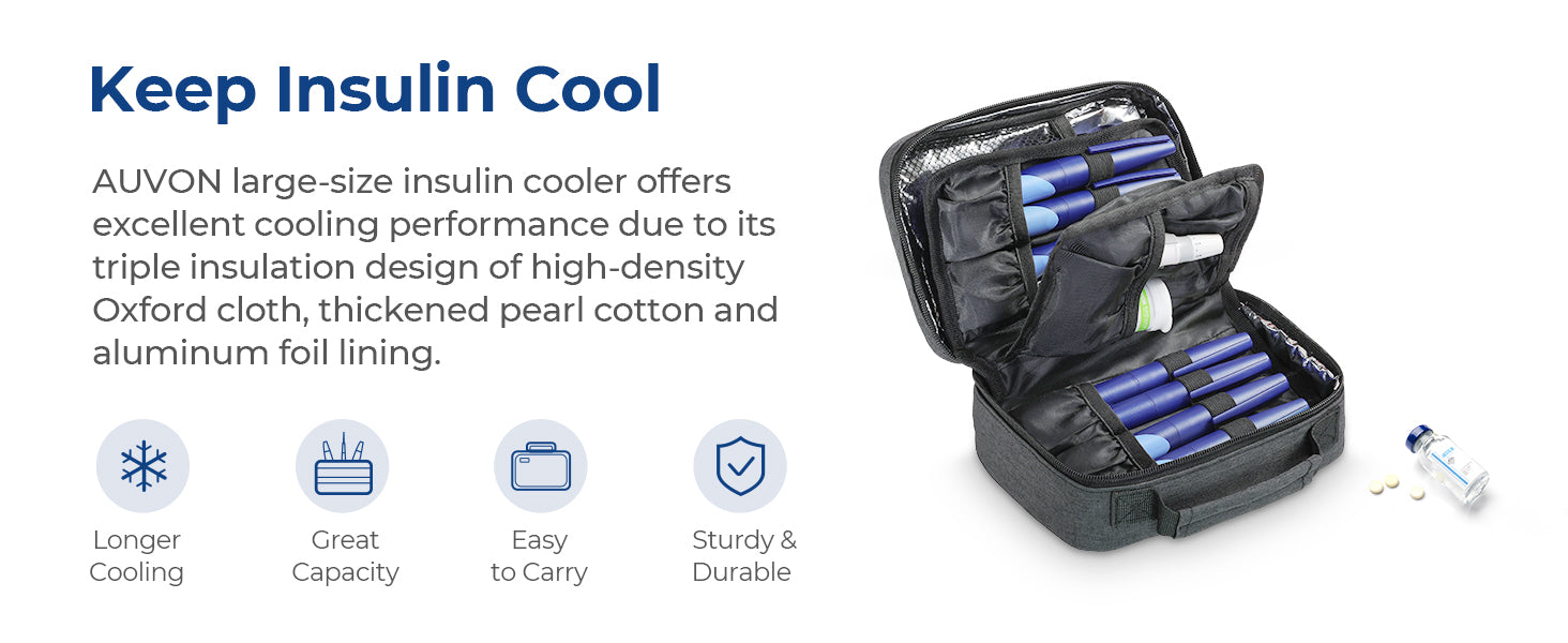 - ULTRA-LONG COOLING EFFECT. AUVON diabetic travel case has 4 latex-free ice packs and each weighing 160g. Based on our internal tests at 25-30℃ temperature, it can keep cool for 10-12 hours after 12 hours of freezing, your ideal travel partner.