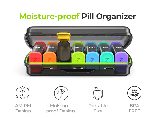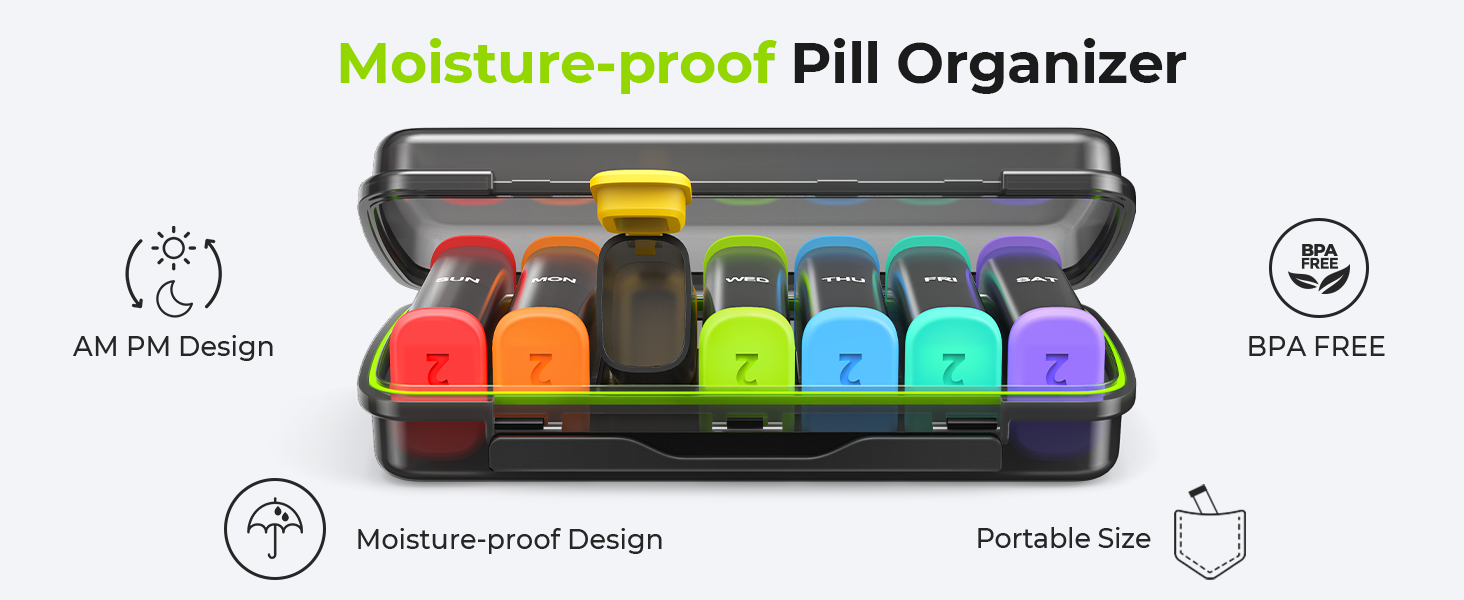- Double Moisture-proof Design: This weekly pill holder 2 times a day features secure moisture-proof silicone lids on each slot, and a unique silicone strip on the outer box with a snap-tight buckle for double moisture protection. Maintain pill efficacy with the pill dispenser