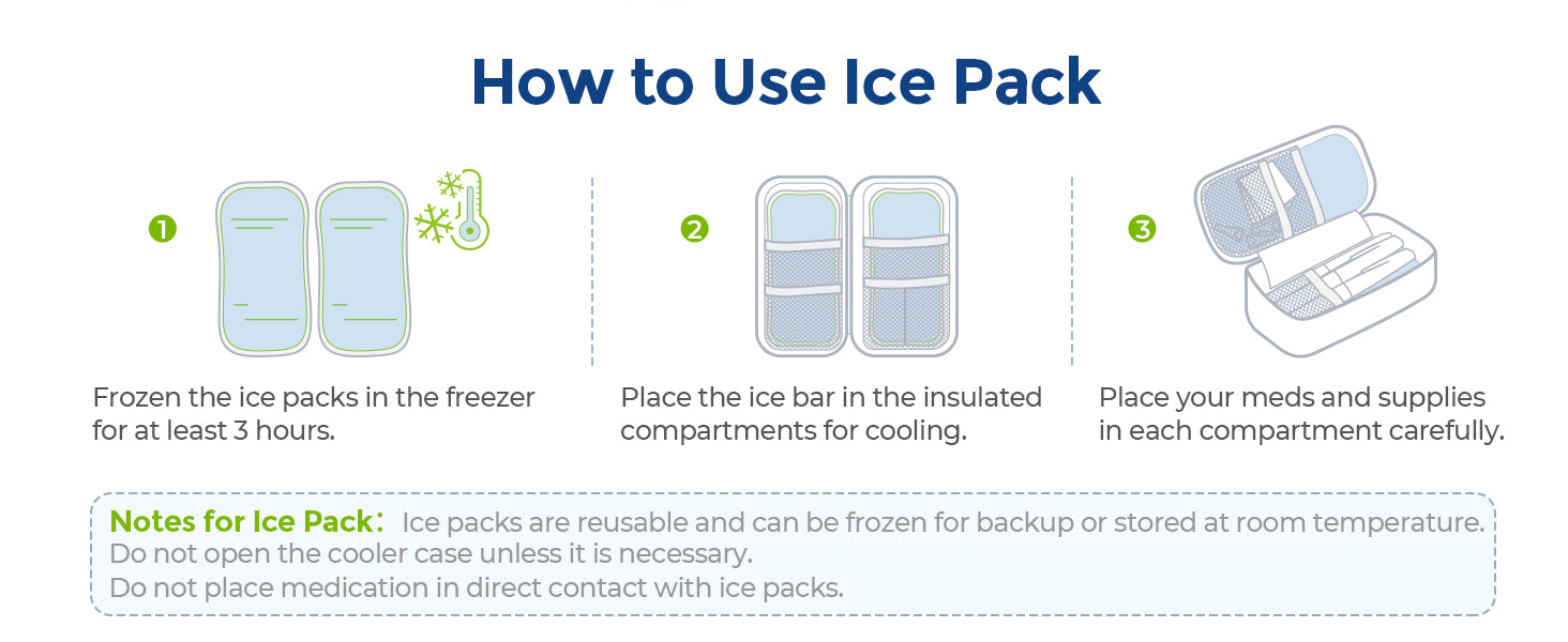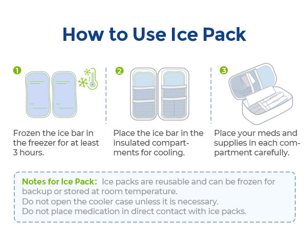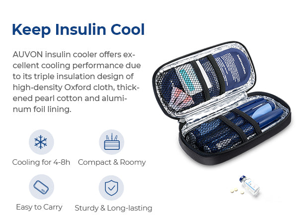 - WHAT YOU RECEIVE. 1 x Compact Insulin Cooler Travel Case, 2 x 90g Reusable Ice Packs, AUVON Warranty Support and Friendly Customer Service.