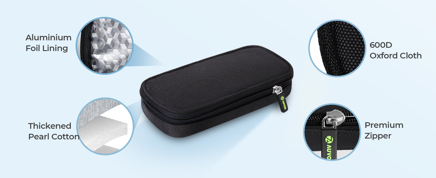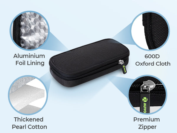 - DURABLE & SAFE. Made of Oxford fabric exterior, thickened pearl cotton and aluminum interior, the diabetes travel case is ideal for keeping hot items and cold supplies in good condition.