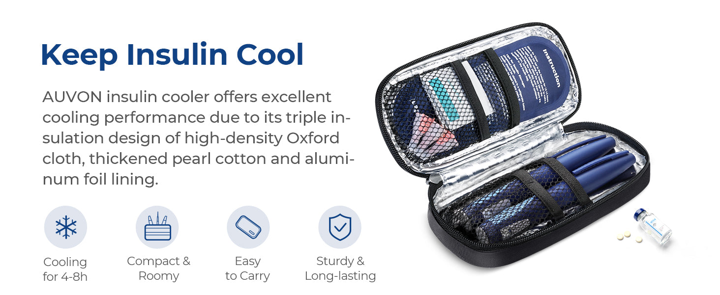 - ORGANIZE WHAT YOU NEED. With a well-designed layout, this insulin case facilitates neat storage for diabetic supplies, such as 2-3 insulin pens, refills, syringes, insulin needles or alcohol wipes. The insulated medication travel bag can pack all you need and keep everything nice and organized when you are daily outing. AUVON offers 4 insulin cooling bags in different sizes, and you can choose what you need.