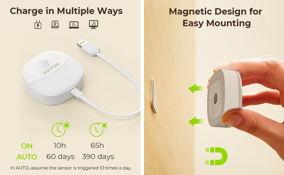 - 2nd Gen Rechargeable Nightlight. No worries about buying and changing non-recyclable AAA batteries frequently. A two-hour charge for this rechargeable battery mini light night can last up to 180 days when choosing Auto+Medium Mode. It's with a magnetic strip for mounting in addition to double-sided 3M adhesive pads for places with limited electricity access. As it can stand on any flat surfaces, you could place it wherever you love for lighting the way.