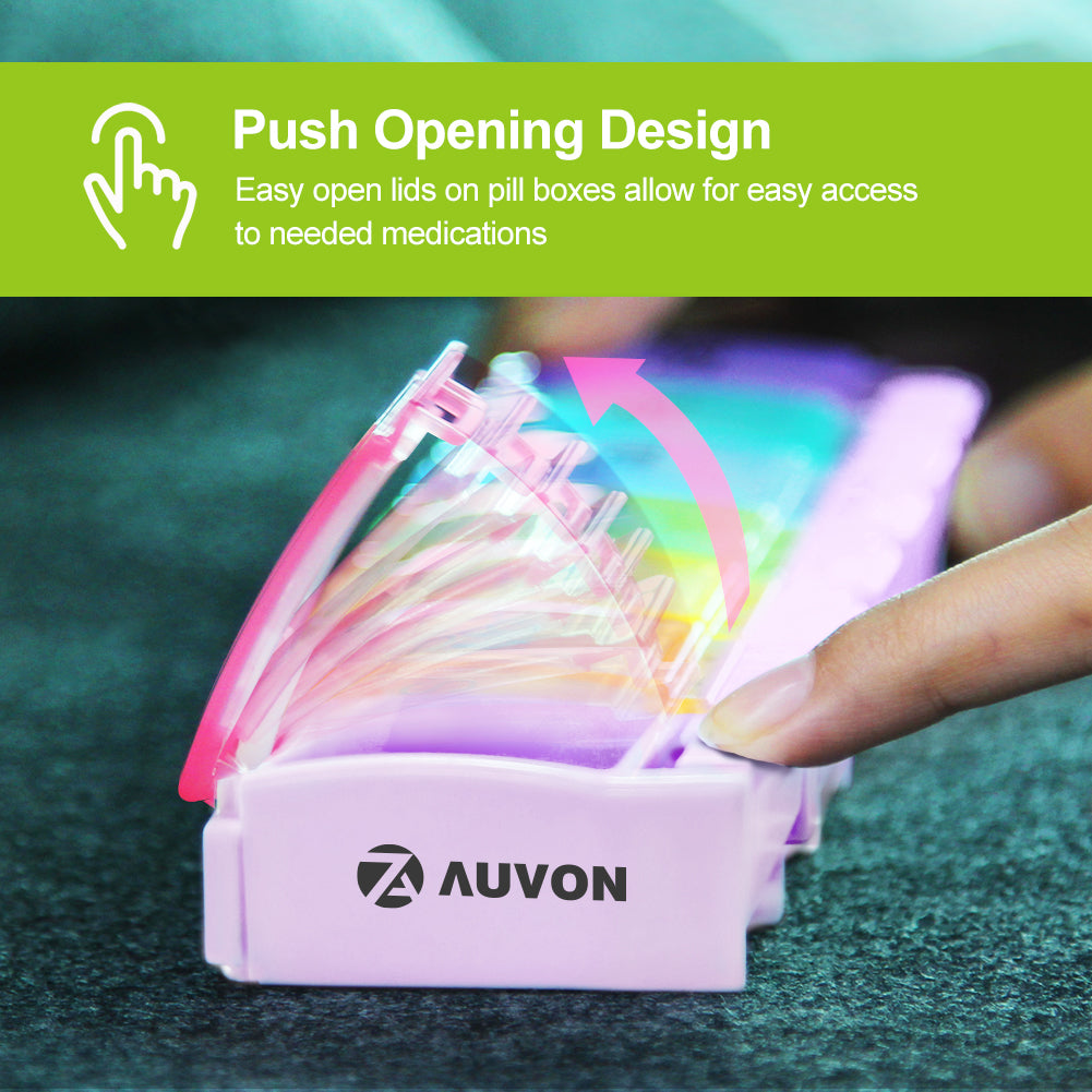 AUVON Weekly Pill Organizer Arthritis Friendly, BPA Free Travel 7 Day Pill Box Case with Spring Open Design and Large Compartment to Hold Vitamins, Cod Liver Oil, Supplements and Medication