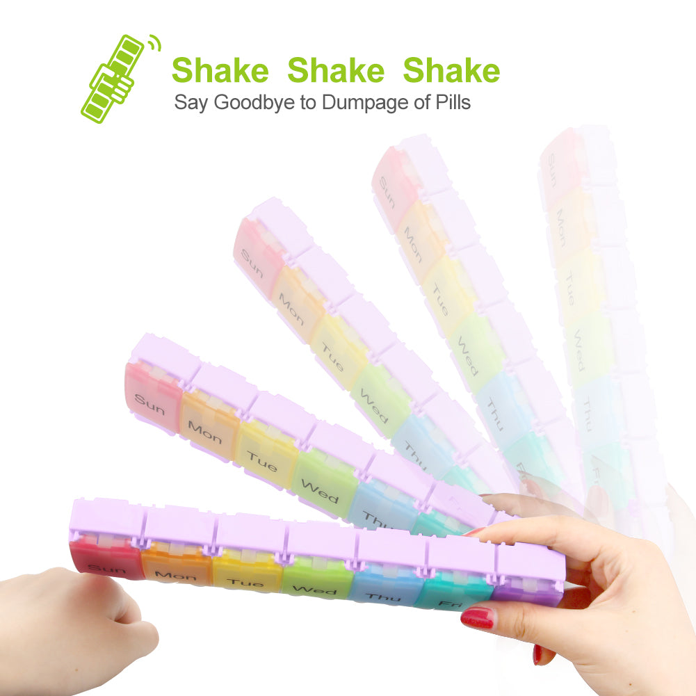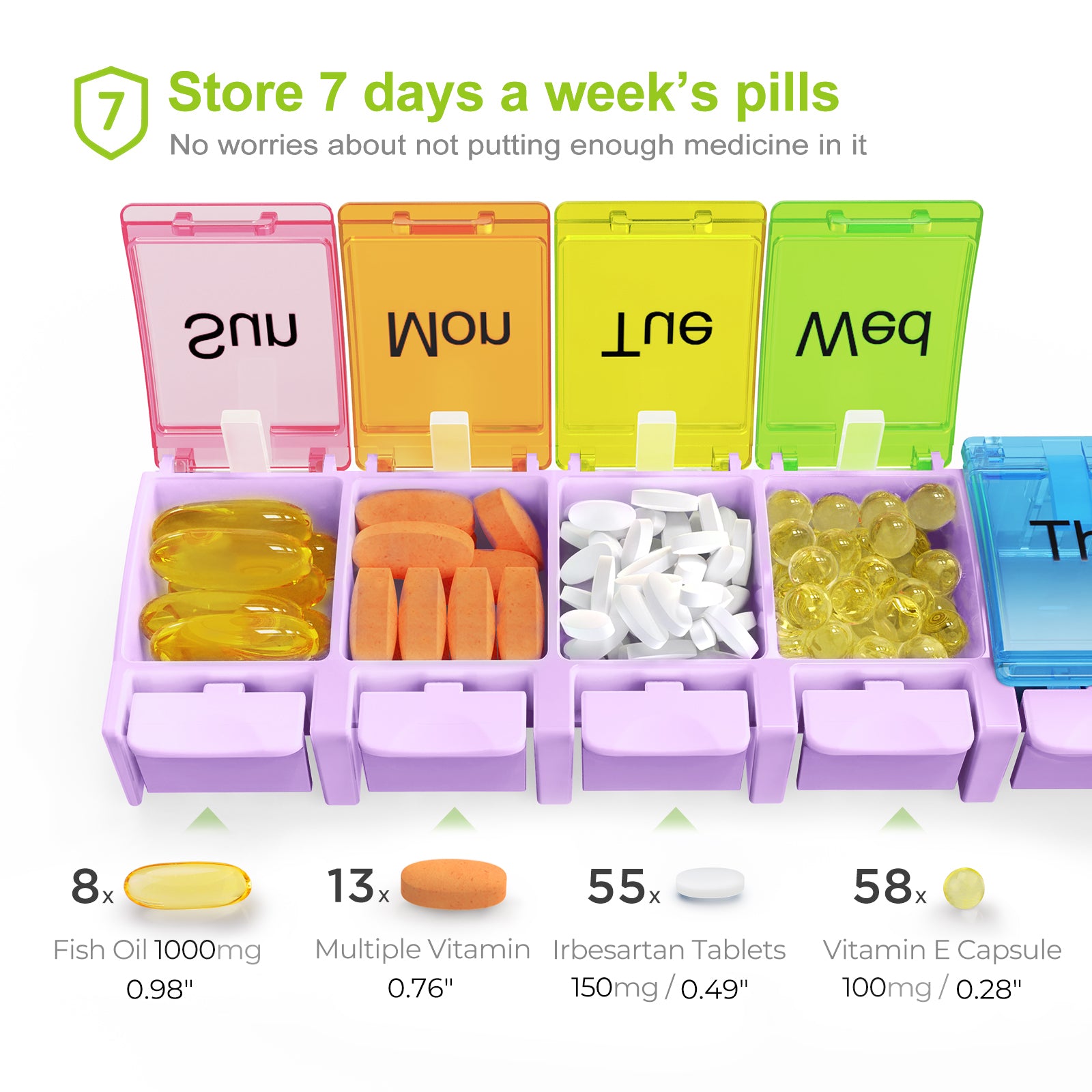 - Spring Assisted Open Design. We use the latest design on this weekly pill organizer to achieve one-handed operation with the little rubber strips for the smart "lid spring open" feature. The lids are all beautifully colored and marked clearly with the date, everything is clear at a glance so you may find it easy to choose the pills you need. It's quite nice for easy daily dispensing and big enough to hold 8 fish oils or 12 large vitamins for each dose (size of each compartment: 1.3"x1.18"x0.82")