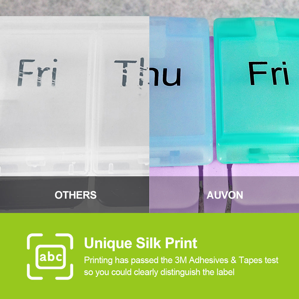 - Premium Screen Printing. To avoid screen-printing fonts and icons falling off from the surface of the pill box, we use high-end screen printing ink and strictly do the Ink Adhesion Test with 3M Tapes before shipment. Thus, no need to be frustrated with the missing fonts of "Tuesday" or icons of "PM", and worry about mistakenly taking the wrong tablets.