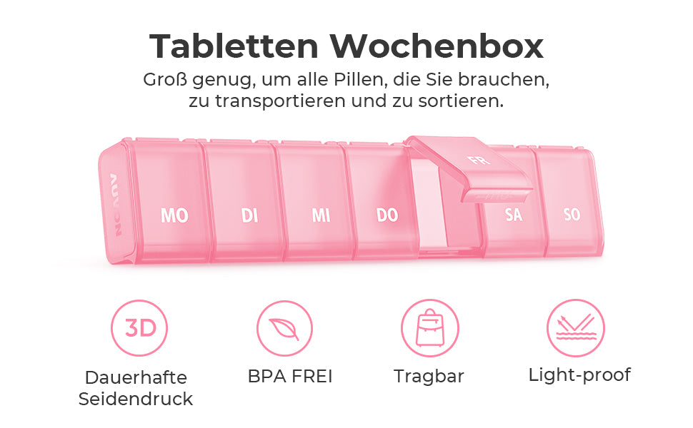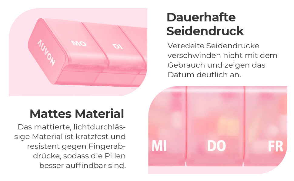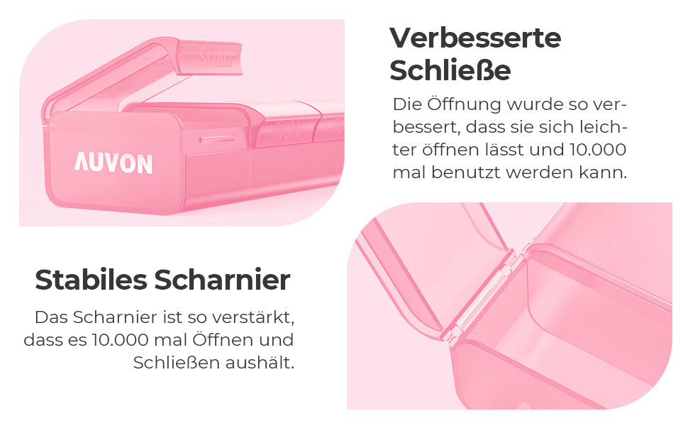 - Reliable Quality. AUVON 7 day pill organizer with an upgraded silk print for clear date indication, even with extensive use. Its durable thick hinge withstands over 10,000 bends, ensuring convenient access to your weekly medications while maintaining its longevity.