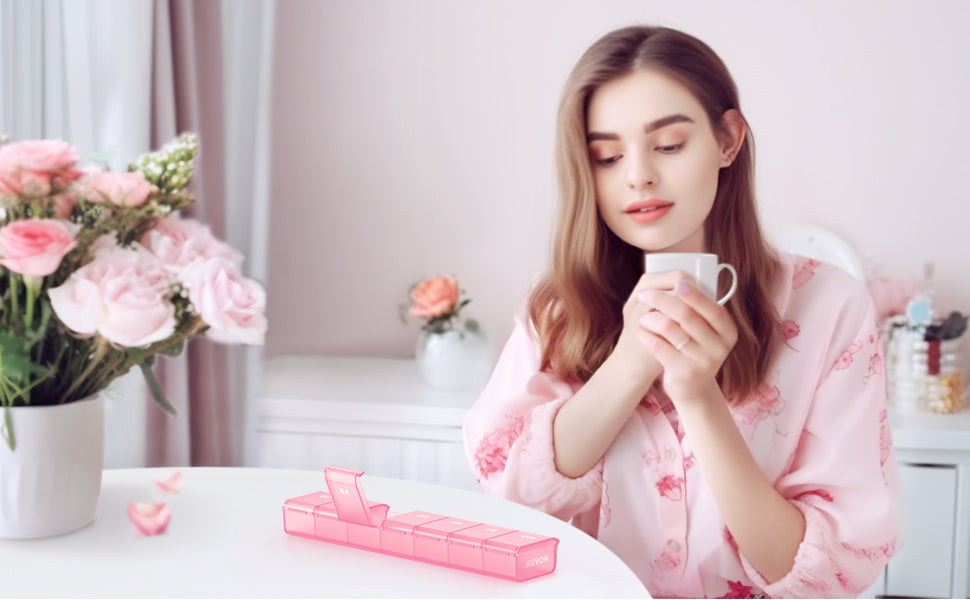 - Compact Design. This travel pill organizer is compact but large enough to store a week's supply for daily & travel use. The stylish pink pill case will be your best partner and help you stay in a good mood on the trip, a little pink, a lot of joy.