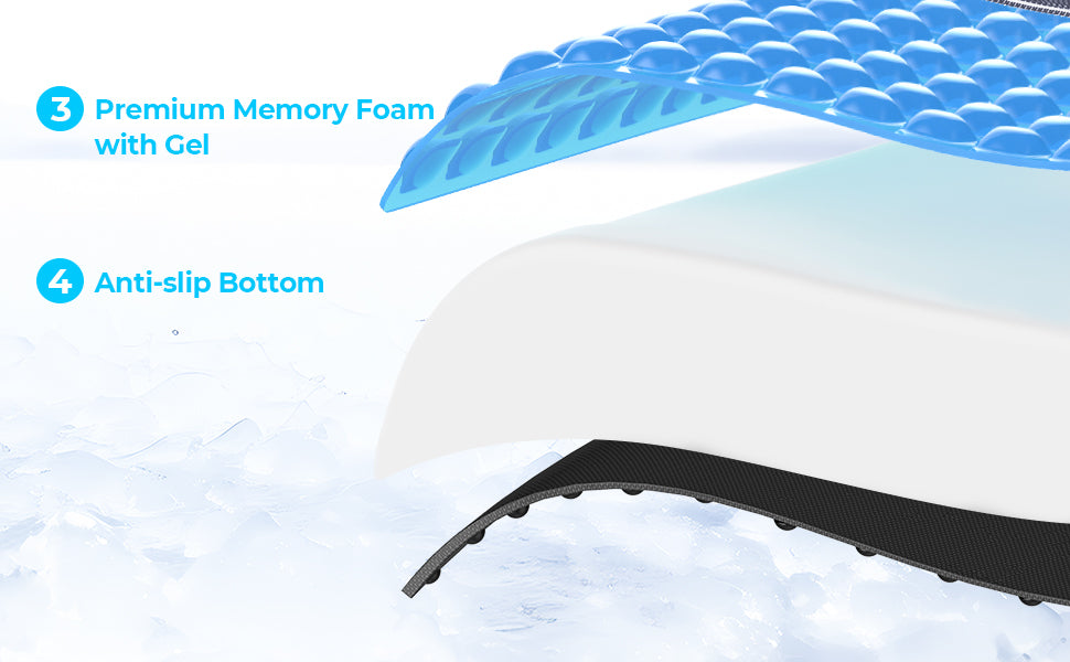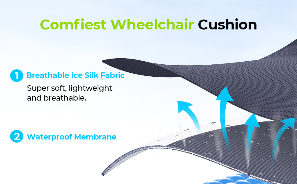 - Long-sitting without Stuffiness. This seat cushion features larger gel coverage (16.4'' x 14.9'') and 3X thicker gel blocks on the market. Adopting breathable memory foam, premium cool tech fabric for ample airflow enhances the cooling effect and meets your relaxation needs. AUVON offers this gel wheelchair seat cushion to save you from long sitting without stuffiness.
