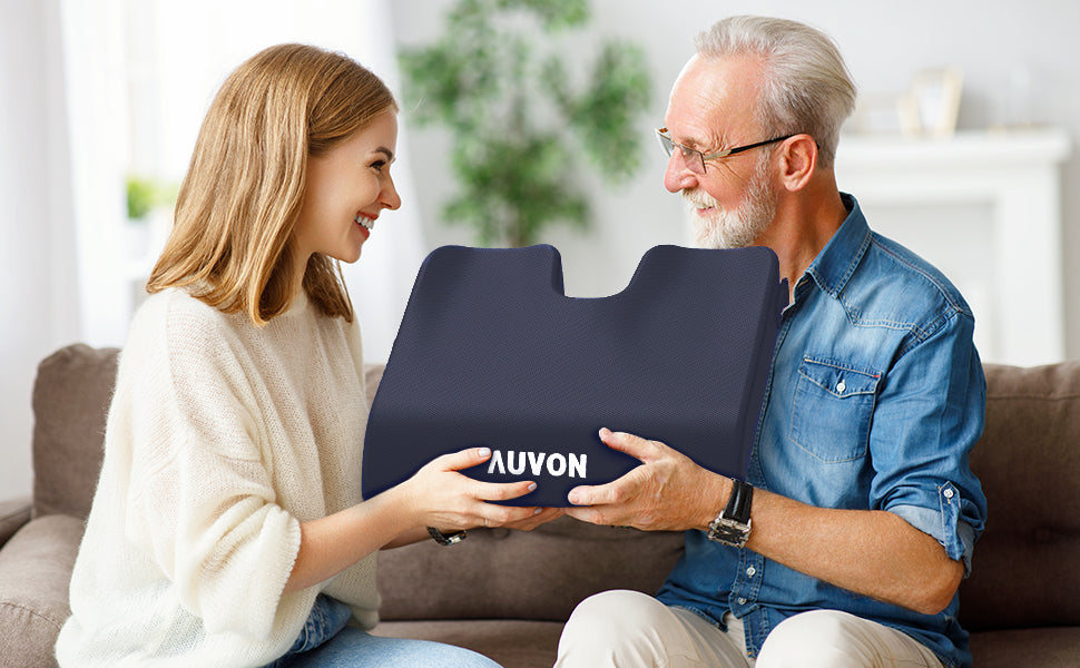 - Ergonomic Support & Relief. With ergonomic & premium memory foam*, this coccyx cushion effectively helps solve the back pain caused by prolonged sitting. The U-shaped design leaves enough space for pressure relief on the tailbone; the temperature-sensitive memory foam offers long-lasting support; the slope design provides adequate support for thighs and promotes your lower body blood flow. *(May feel firmer and less comfortable under 68℉ due to temperature-sensitive memory foam.)
