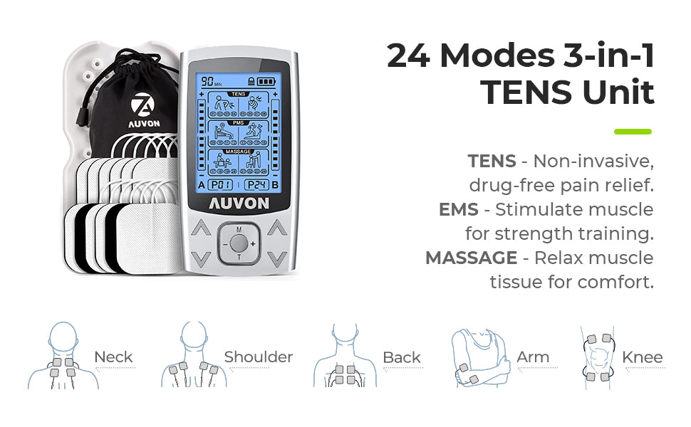 - Multi-Functional with 24 Mode. 20 levels of intensity, 24 preprogrammed massage modes with adjustable time (maximum to 90 min). With built-in powerful rechargeable lithium battery, the AUVON rechargeable TENS unit can give you continuous use up to 10 hours!