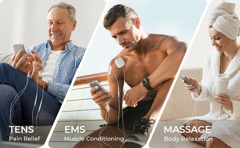- TENS + EMS Combination Unit. AUVON TENS & PMS / EMS device combines 2 therapies in 1 device, in which TENS provides safe, non-invasive, drug-free methods of pain relief used by doctors and physical therapists for years. PMS / EMS brings elicitation of muscle contraction using electrical impulses and activates the muscles to assist in the increase of strength and endurance as a rehab and strength training tool.