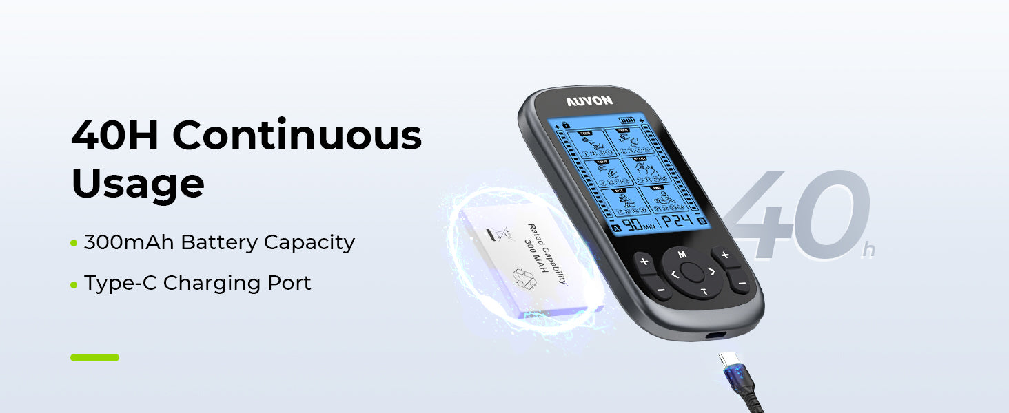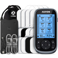 What You Receive: 1 x Dual Channel Electrodes Muscle Stimulator, 8 x Square 2" TENS Machine Pads, 4 x Large Rectangular 2" x 4" Pads, 2 x Lead Wires, 1 x Pads Holders, 1 x Type-C Cable, 1 x User Manual, AUVON 24-month warranty support, and friendly customer service
