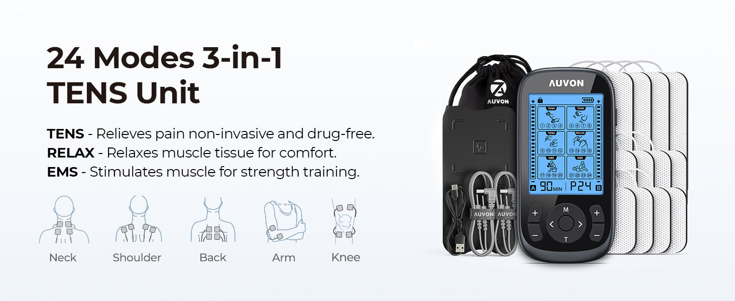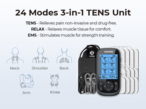 AUVON 3-in-1 TENS Unit Muscle Stimulator, EMS Massage Machine with 40 Intensities for Gradual Shoulder, Sciatica, Back Pain Relief, 24 Modes Rechargeable Electronic Pulse Massager with 12 TENS Pads