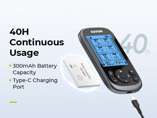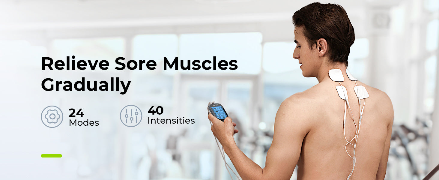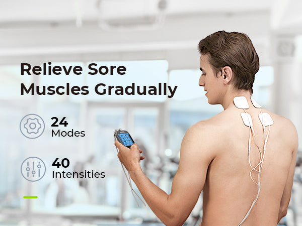 - More Options for Gradual Pain Relief: This electric massager for muscles features 40 current levels and 24 pre-programmed modes that allow you to enjoy gradual relief therapy without shock feelings. The therapy time is adjustable up to 90 minutes in continue mode. The stim machine with the A/B channel can offer the relaxing options of 2 or 4 pads at the same time