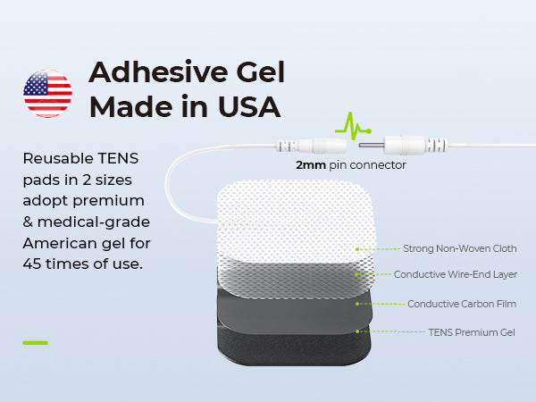 - American Gel TENS Unit Pads: The TENS unit electrode pads adopt the industry-leading US adhesive gel for better self-adhesive performance and are easy to clean after 45 uses. Upgraded TPE connecting wires are less prone to tangling and breakage