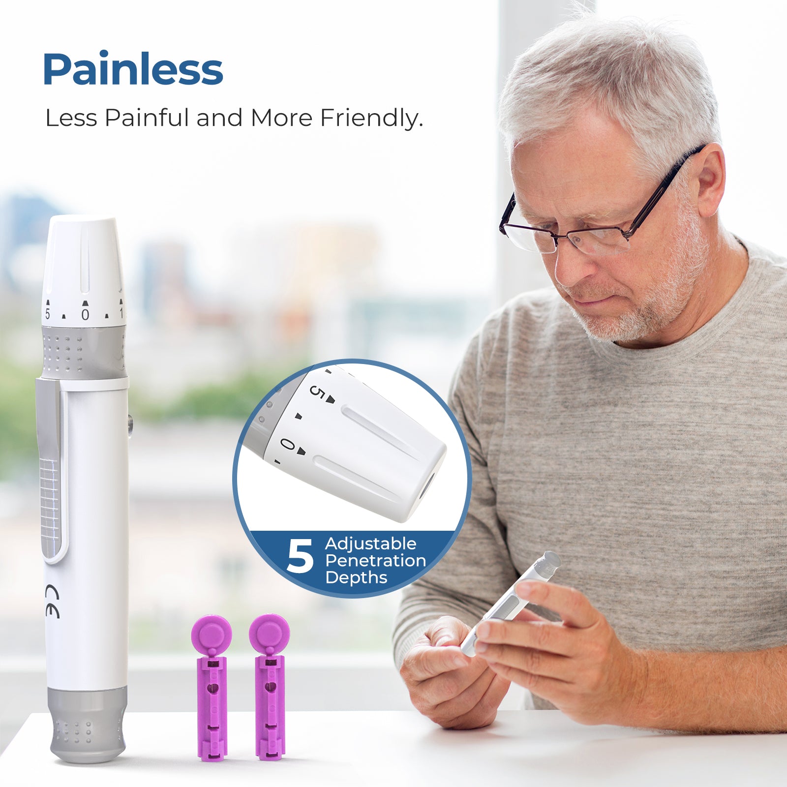 - EASY TO USE. Follow the glucose monitor kit operation video and you can get results in 6s. The code-free design, 10-depth settings and smooth release all make finger pricking easy, fast and painless.