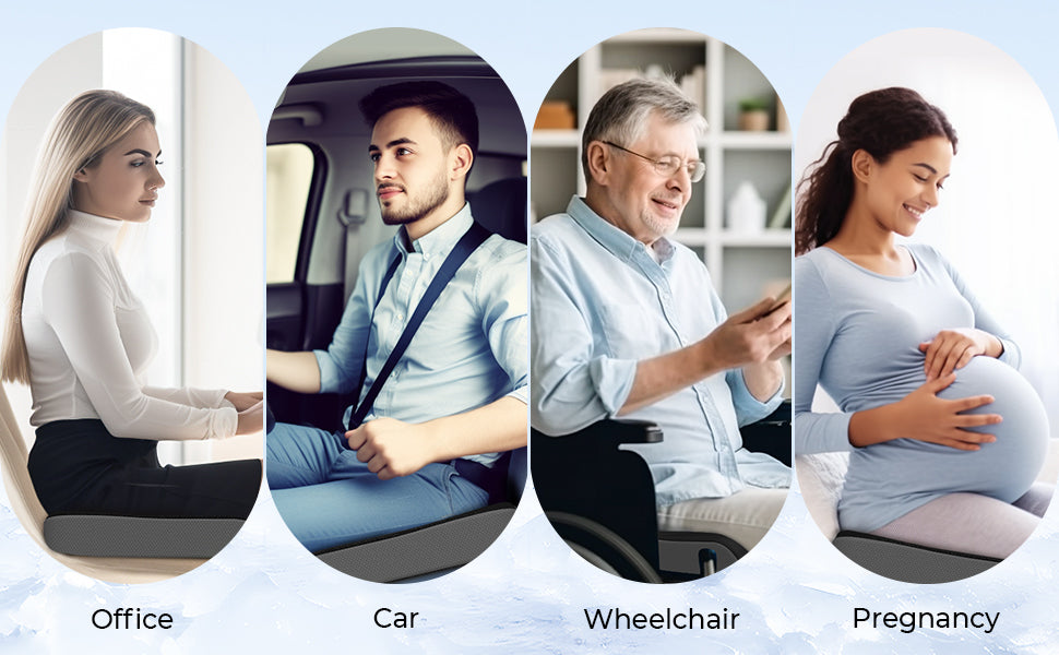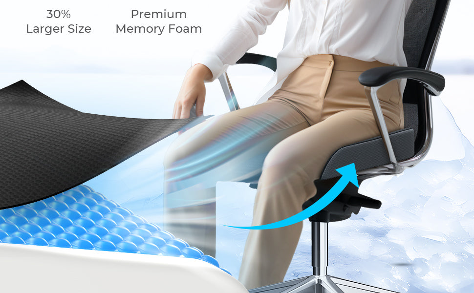 - Pressure Relief for Back, Sciatic, Tailbone. The ergonomic XL memory foam cushion with a slope design can provide good support for your thighs and help promote blood circulation. Its U-shaped cutout design relieves compressive pressure and pain on the coccyx. The gel cooling cushion offers you continuous, all-day sitting relief.