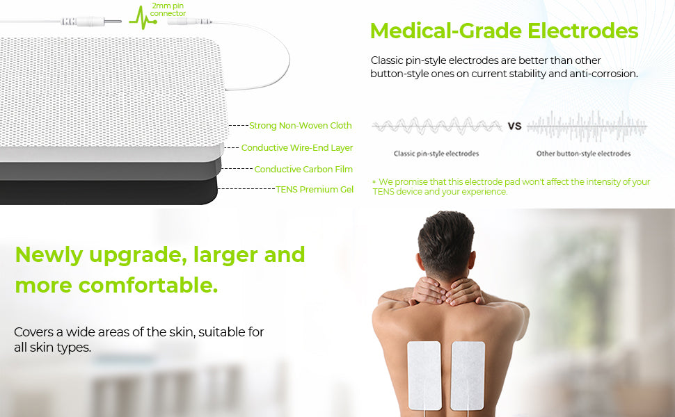 The classic pin electrode pads have better current stability and anti- corrosion than other button electrode pads. AUVON electrode pads also feature a 4-layer structure for good conductivity. Please increase the channel intensity when using this large pad, because the larger pads need stronger current to ensure the stability and effect of the pulse intensity.