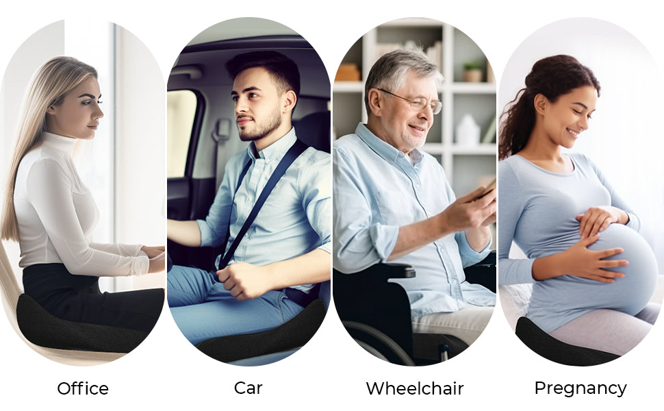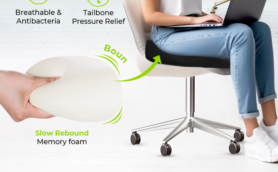 - Relieve Sitting Pressure. Prolonged sitting easily causes coccyx compression and sciatic nerve pressure even hemorrhoids. This sciatica pain relief pillow corrects your sitting posture to promote thigh blood circulation and offers long-lasting comfort when long sitting. This seat cushion for office chairs and home use caters to the needs of men and women alike, which elevates your seating experience to a new level of comfort.