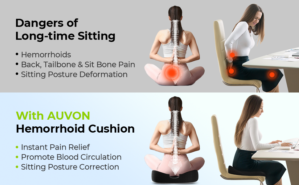 - Premium Memory Foam, Never Flatten. The doughnut pillow adopts high-density memory foam instead of cheap polyurethane foam and offers lasting support and temperature-sensitive contouring to relieve bottom pressure and hemorrhoid pain. Choose AUVON coccyx cushion to start your comfortable and healthy sitting experience.