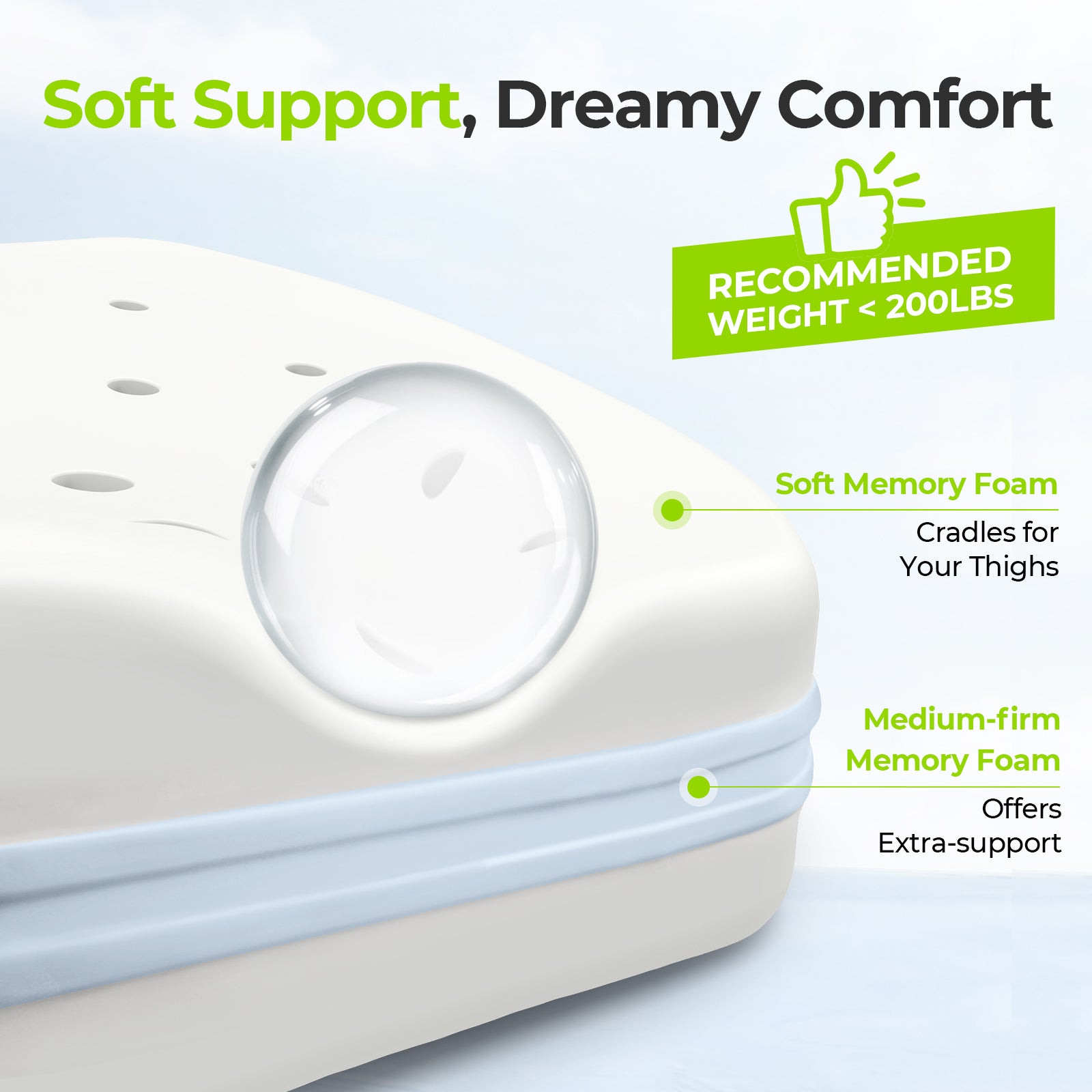 - New-generation Sandwich Design for a Balance of Softness & Support. AUVON team had researched all the knee pillows on the market and found the user's real need was a balance of firm support and softness. So AUVON team launched this hip pillow (size: 10 x 9.5 x 2.5 inches) with a new combination of soft and medium-firm memory foam, which can achieve an ideal balance of softness and support comfort. The soft memory foam can cradle your leg curves and the inner medium-firm memory foam can offer extra support without flattening.