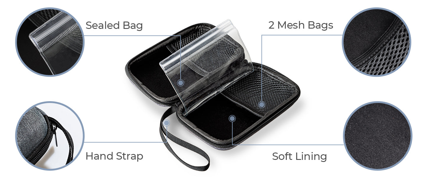 - Practical Design. The travel case is designed with 3 sections (2 mesh bags, 1 sealed bag) to keep all items well organized and messy no more. The 2 mesh bags have an elastic band which is durable and won't break easily, also the heavy-duty zipper is smooth for quick access.