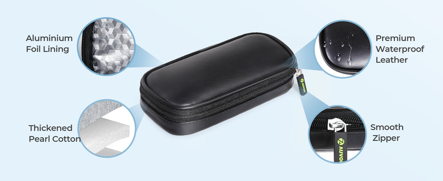 - PREMIUM LEATHER FOR BETTER PROTECTION. This insulin travel case is crafted with high-quality waterproof leather in a sleek and stylish look. The thickened pearl cotton matching an aluminum interior can create an ideal condition to keep your diabetic supplies effective. The leather fabric allows you to clean the diabetic care organizer with just a damp cloth or wipes.