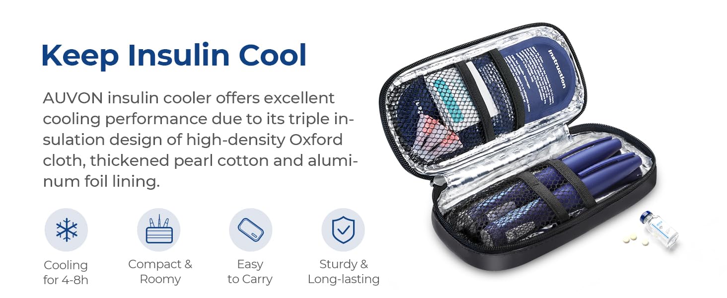 - WHAT YOU RECEIVE. 1 x Compact Insulin Cooler Travel Case, 2 x 90g Reusable Ice Packs, AUVON Warranty Support and Friendly Customer Service.