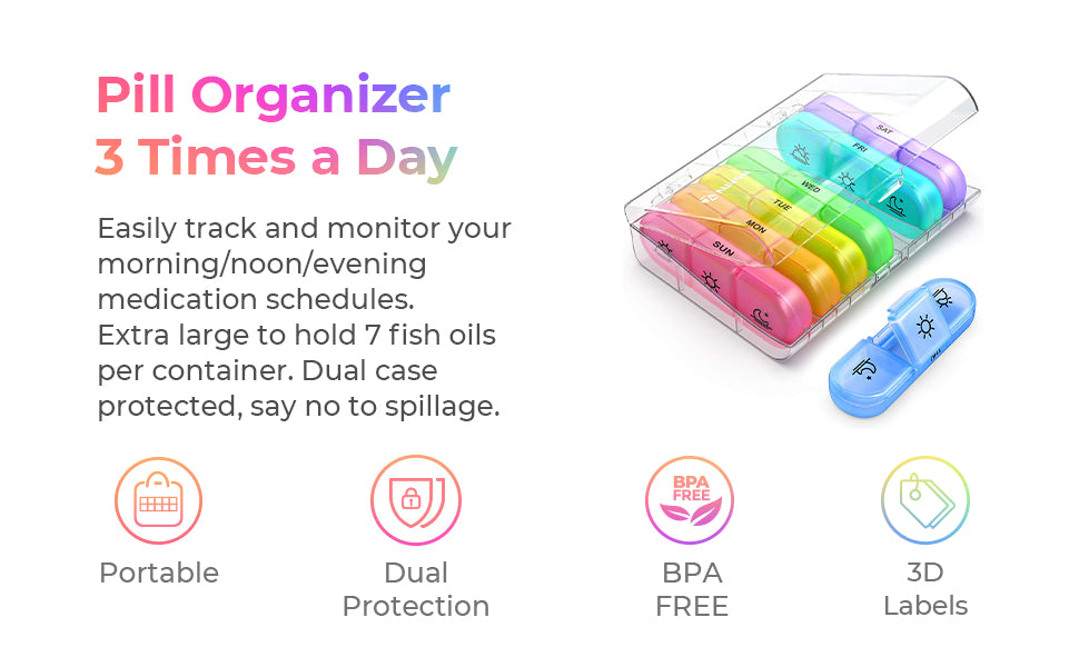 AUVON Weekly Pill Organizer 3-Times-A-Day, Portable 7 Day Pill Box Case with Large Separate Compartments to Hold Medication, Vitamins, Fish Oil and Supplements