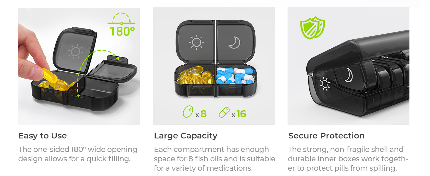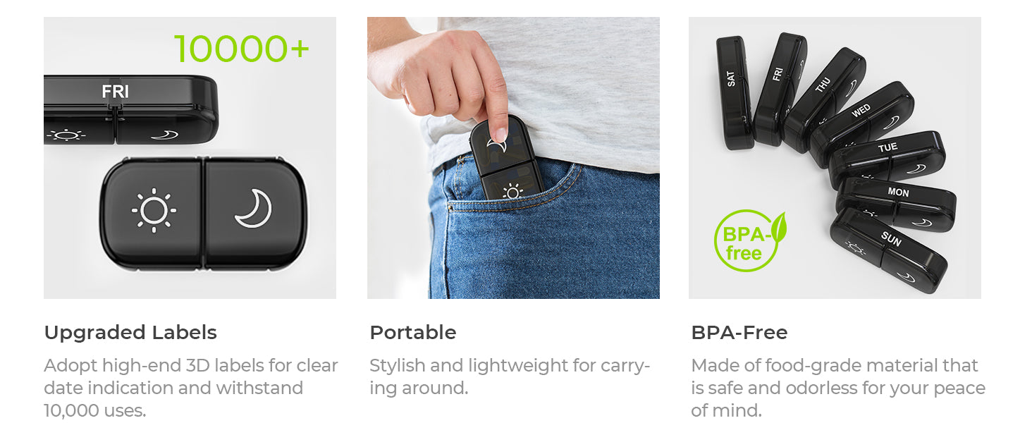- Super Portable: Each day of the pill holder can fit in any of your wallet or pockets, and the whole morning and night pill boxes with a black case can protect your medication privacy while holding a week's pills for your travel.